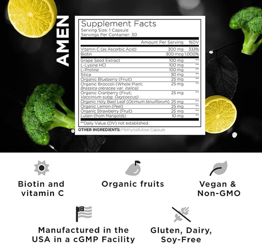 Amen Plant-Based Vegan Collagen Builder Supplement - Organic Whole Foods, Lutein, Vitamin C, Biotin, Lysine, Proline Collagen Boosters - Organic Cranberry, Lemon, Strawberry - Once A Day - 30 Capsules