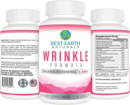 Best Earth Naturals Wrinkle Formula with Hyaluronic Acid, Niacinamide, Multi Vitamin, Collagen for Women or Men - Skin Vitamins Supplement -30 Day Supply (30 Capsules)