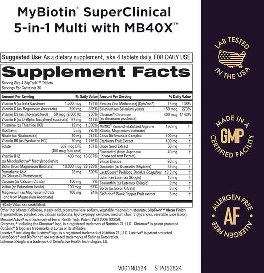 Purity Products MyBiotin SuperClinical New 5-in-1 Elite Multivitamin + MB40X Biotin Matrix Daily Multi - Thicker Hair Starting in 3 Weeks - 40X More Soluble vs Ordinary Hair Skin Nails - 120 Tabs