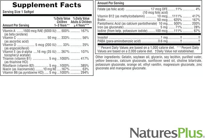 - COMPLETE WITH ESSENTIAL NUTRIENTS - The gluten-free gelatin capsules contain a balanced profile of essential vitamins and nutrients including Vitamin A, B1, B2, B12, C, D3, E, calcium, magnesium, iodine, iron, zinc, and potassium.