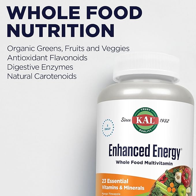 KAL Enhanced Energy Supplements, Whole Food Chewable Multivitamin with Iron, 3 Daily, 23 Essential Vitamins and Minerals, Super Foods, Enzymes, Mango Pineapple Flavor, 60-Day Guarantee, 20 Serv, 60ct