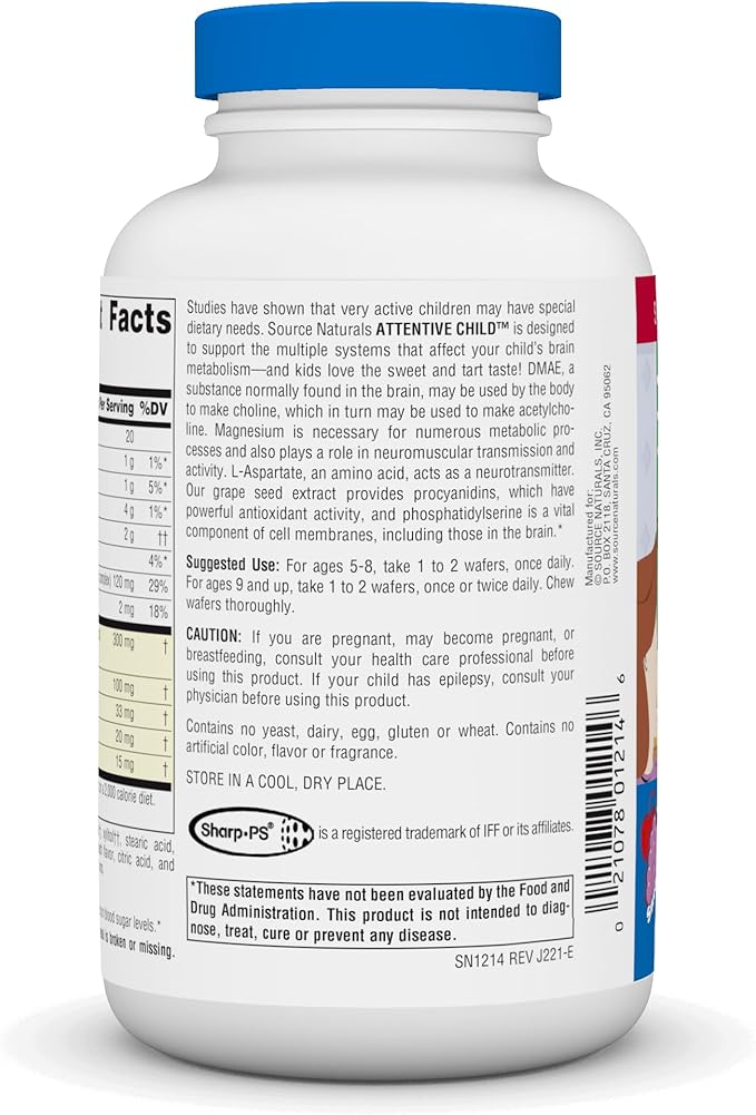 Source Naturals Attentive Child - Healthy Cognitive Nutrients for Active Children - Improved Focus & Attention with DMAE, Magnesium, Zinc & Grape Seed Extract - 60 Chewable Wafers.