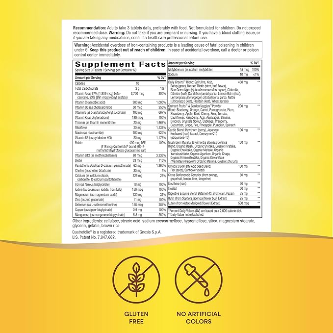 - Formulated with 23 vitamins and minerals, including 200% or more Daily Value of 12 vitamins and minerals per 3-tablet serving. With ultra-potent B-vitamins including methyl B12, vitamin A, vitamin C, vitamin D3, vitamin E, biotin, and zinc.