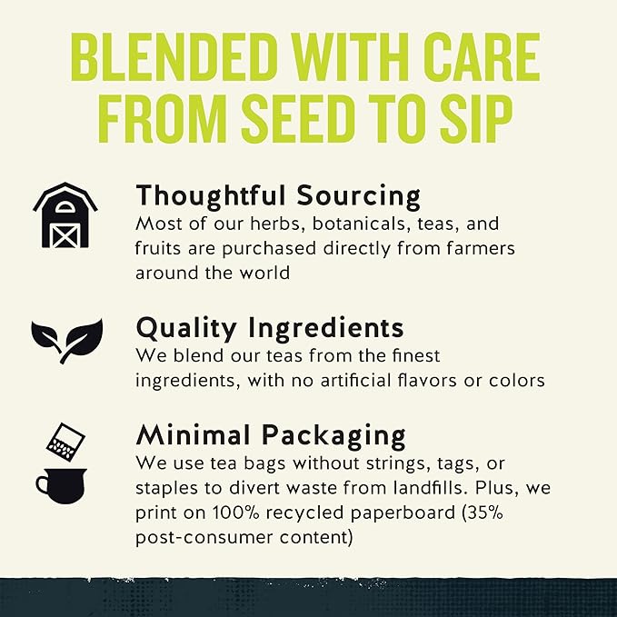 - Minimal Packaging: We use tea bags without strings, tags, or staples to divert waste from landfills. Plus, we print on 100% recycled paperboard (35% post-consumer content).