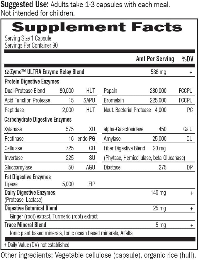 - THE END-ALL, BE-ALL: Look no further than Omega-zyme ULTRA which offers a broad-spectrum formula of 21 powerful digestive enzymes, each with a specific function to help your body break down difficult to digest foods and support overall digestive function