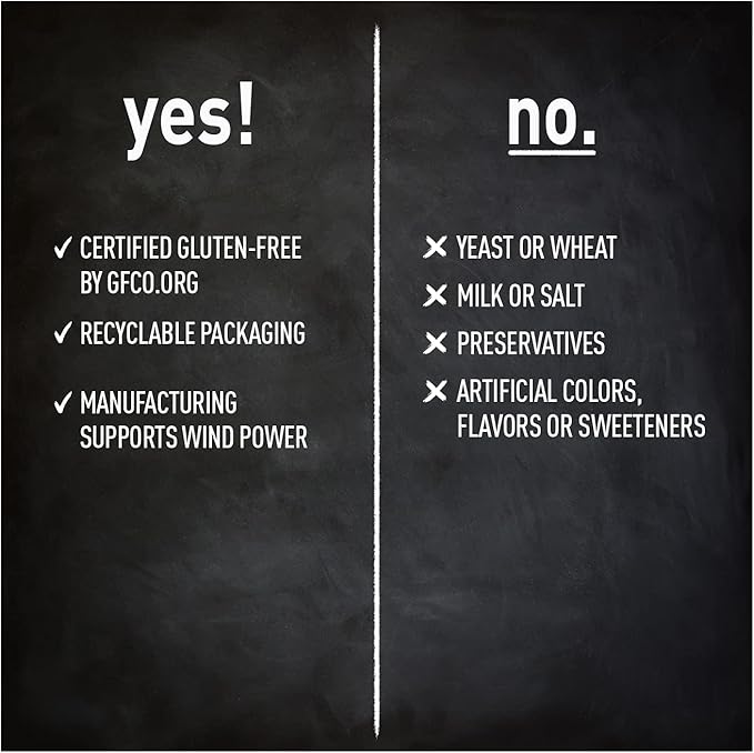- CONTAINS ABSOLUTELY NO: Yeast - Wheat -Milk - Salt - Preservatives - Artificial Colors - Artificial Flavors - Artificial Sweeteners