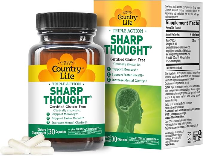 - Flavor : Country Life Sharp Thought 30 Capsules, Certified Gluten Free