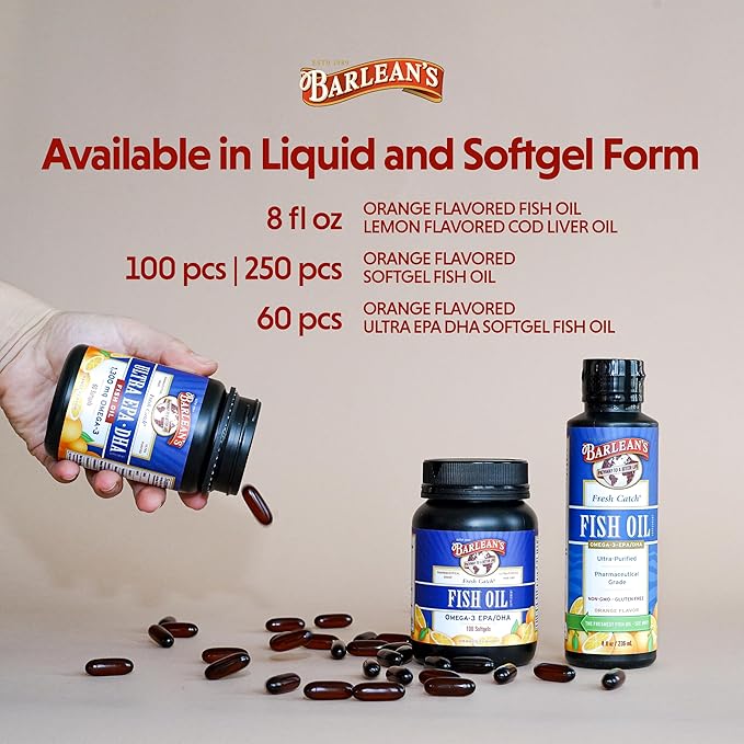 Barlean's Fish Oil Omega 3 Supplement, EPA & DHA Fatty Acid Softgels for Joint, Brain, & Heart Health, 1000mg Orange Flavored Fish Oil Pills, 100 Count