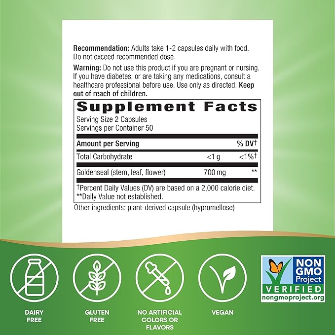 - Formulated with 700 mg goldenseal per 2-capsule serving