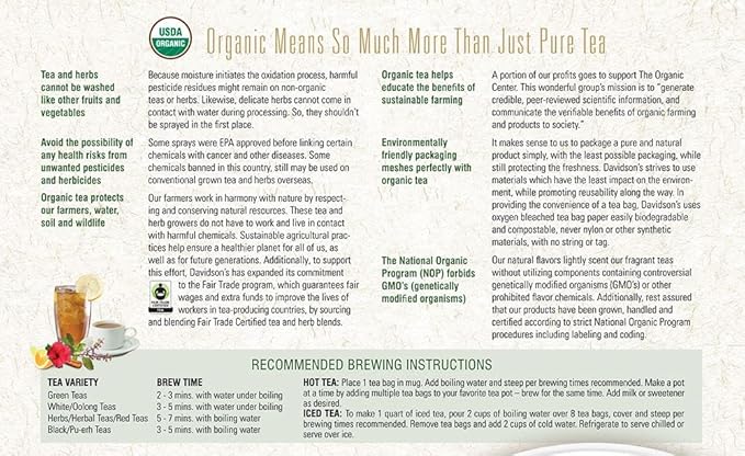 - ALWAYS ORGANIC: Davidson’s Organics is a 3rd generation organic tea grower delivering on its promise of providing top-notch USDA certified organic teas. Our teas are grown non-GMO & free from harmful chemicals and pesticides. We are responsibly sourced and sustainably farmed. We believe in the holistic health of our farms, farmers, plants & animals.