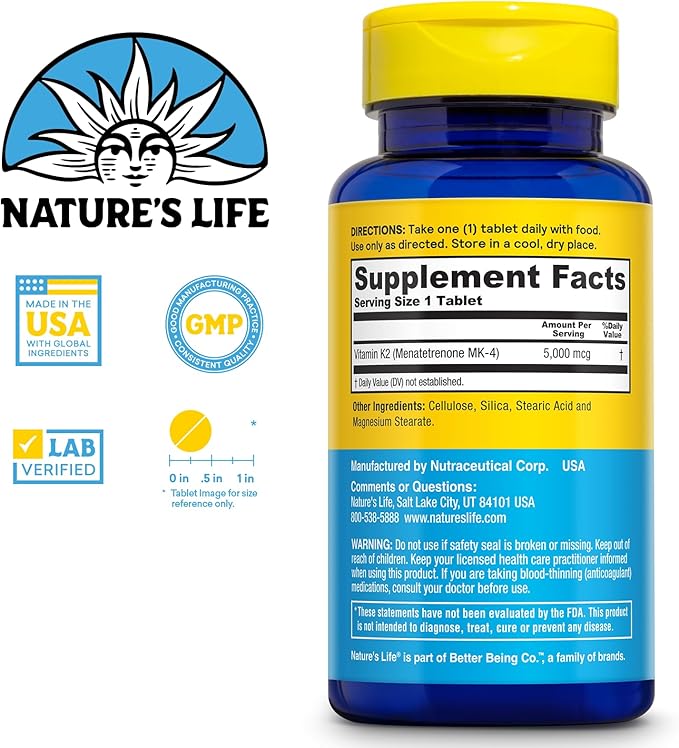 NATURE'S LIFE Revitalizing Vitamin K2 - Bone Health, Artery and Heart Health Support - High Potency Vitamin K Supplement as Vitamin K2 MK4-60 Day Guarantee, Lab Verified - 60 Servings, 60 Tablets