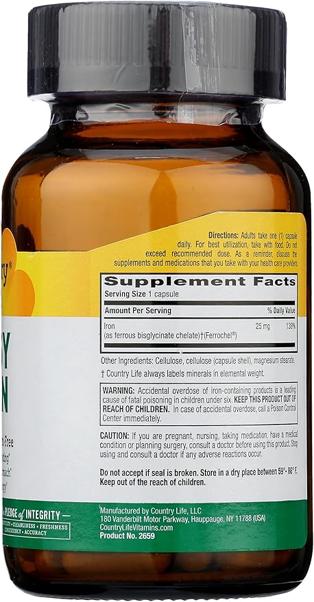 Country Life Easy Iron 25mg Capsules - Gentle Non-Constipating Ferrochel - Vegan Vitamin Supplement for Women & Men - Supports Body Energy - Multivitamin with Iron