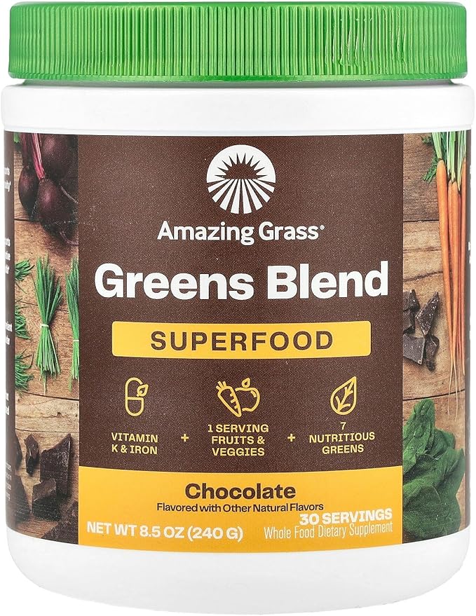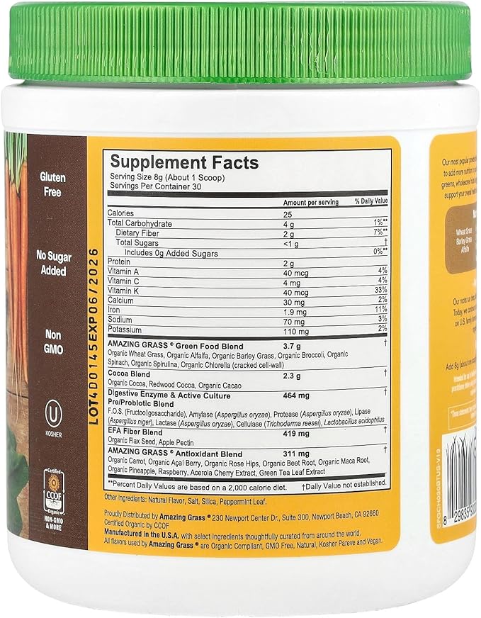 Amazing Grass Greens Superfood Powder: Greens Powder with Digestive Enzymes & Probiotics, Organic Spirulina, Chlorella, and Beet Root Powder, Chocolate, 30 Servings