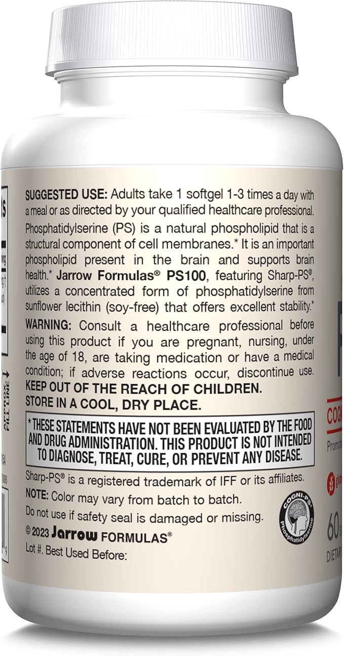 - Brain Health and Cognition Support Supplement*: Contains one 60 count bottle of Jarrow Formulas PS100 Phosphatidylserine 100 mg softgels for a 20- to 60-day supply.