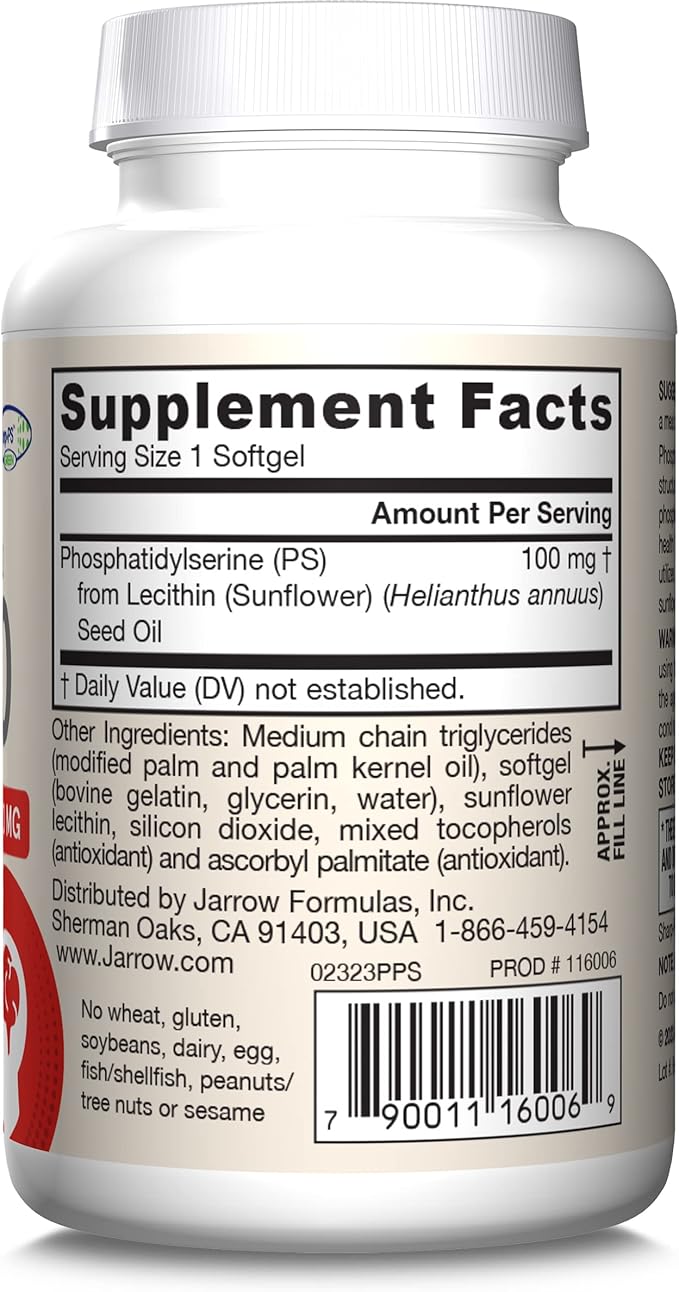 Jarrow Formulas PS100 Phosphatidylserine 100 mg, Dietary Supplement for Brain Health and Cognition Support, 60 Softgels, 20-60 Day Supply