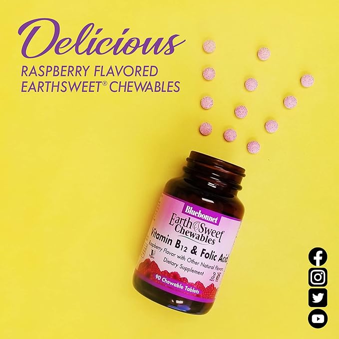 - Raspberry flavored, chewable tablets formulated with 1000 mcg of crystalline vitamin B12 and 400 mcg of folic acid sweetened with EarthSweet