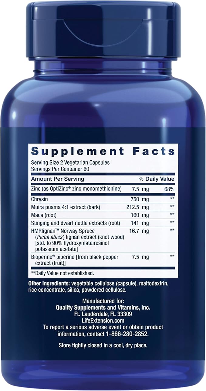 Life Extension Super Miraforte with Standardized Lignans, chrysin, Nettle Root, Muira puama, maca, zinc, Focused Formula for Testosterone Benefits, Vegetarian, Gluten-Free, Non-GMO, 120 Capsules