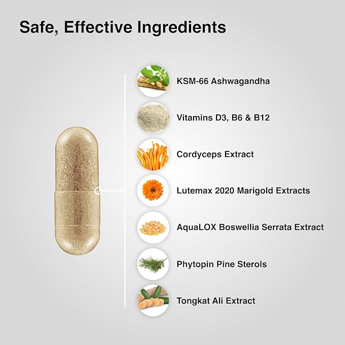 - Powerful Clinically Tested Ingredients, 600mg KSM-66 Ashwagandha, 40mg AquaLOX, 84mg Phytopin, and 12mg Lutemax 2020 per serving