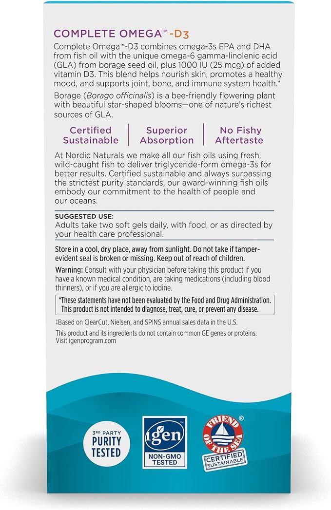 Nordic Naturals Complete Omega-D3, Lemon Flavor - 120 Soft Gels - 565 mg Omega-3 + 70 mg GLA + 1000 IU Vitamin D3 - EPA & DHA - Healthy Skin & Joints, Cognition, Positive Mood - Non-GMO - 60 Servings