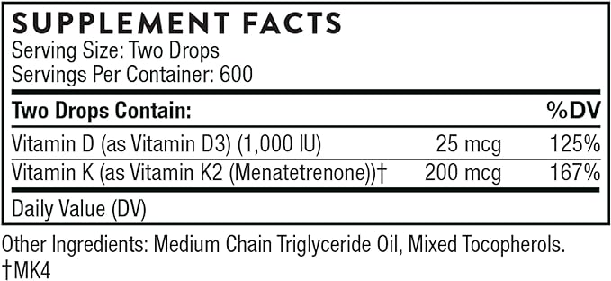 THORNE Vitamin D + K2 Liquid with a metered Dispenser - Vitamins D3 and K2 to Support Healthy Bones and Muscles* - 1 Fl Oz (30 ml) - 600 Servings