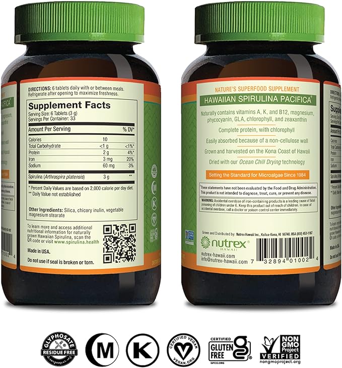 Nutrex Hawaii, Pure Hawaiian Spirulina 500 mg, Vegan, Supports Immune System, Heart, Cells and Energy, 200 Tablets