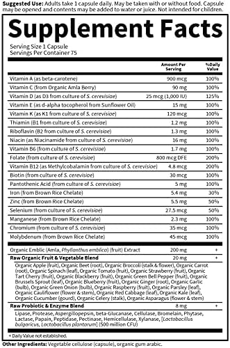 - MULTIVITAMIN WITH PROBIOTICS & WHOLE FOODS: One a day women's vitamins support energy, metabolism as well as radiant skin and nails; 24 powdered organically grown raw fruits and vegetables add supporting antioxidants, vitamins & nutrient cofactors