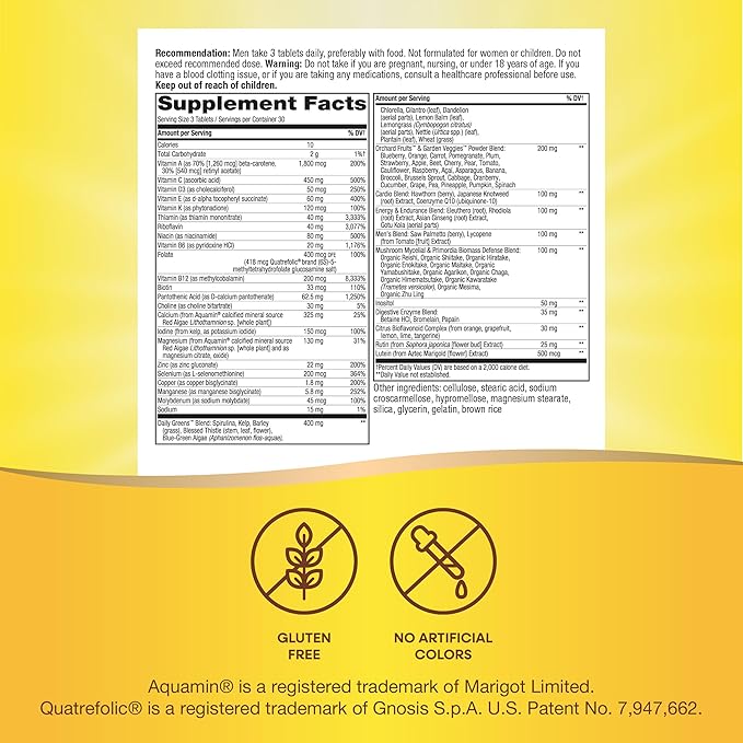 - Formulated with 22 vitamins and minerals, including 200% or more Daily Value of 14 vitamins and minerals per 3-tablet serving. With ultra potent B-vitamins including methyl B12 and vitamin A, vitamin C, vitamin D3, vitamin E, biotin, and zinc.