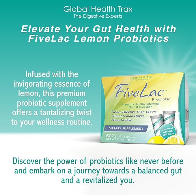 GHT - FiveLac Lemon Probiotic Powder Drink Mix, Probiotics for Women, Men, and Kids - Smooth Digestive Support and Elimination - Relieves Occasional Constipation and Gas - 60 Packets (2 Pack) Non-GMO