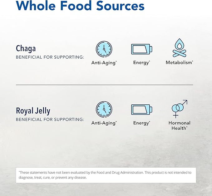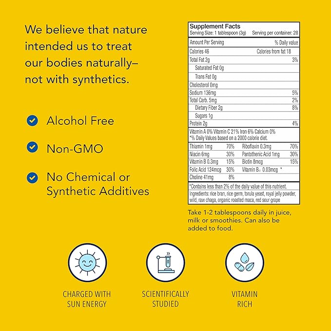 - Full Ingredient List; Rice bran, rice germ, torula yeast, royal jelly powder, wild raw chaga, organic roasted maca, red sour grape; Free of all chemicals, pesticides & additives; Non-GMO