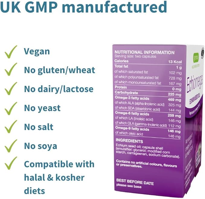 Echiomega Vegan Triple Omega 3 6 9 500 mg, Echium Seed Oil, EFA Supplement for Women with GLA, 60 Softgels