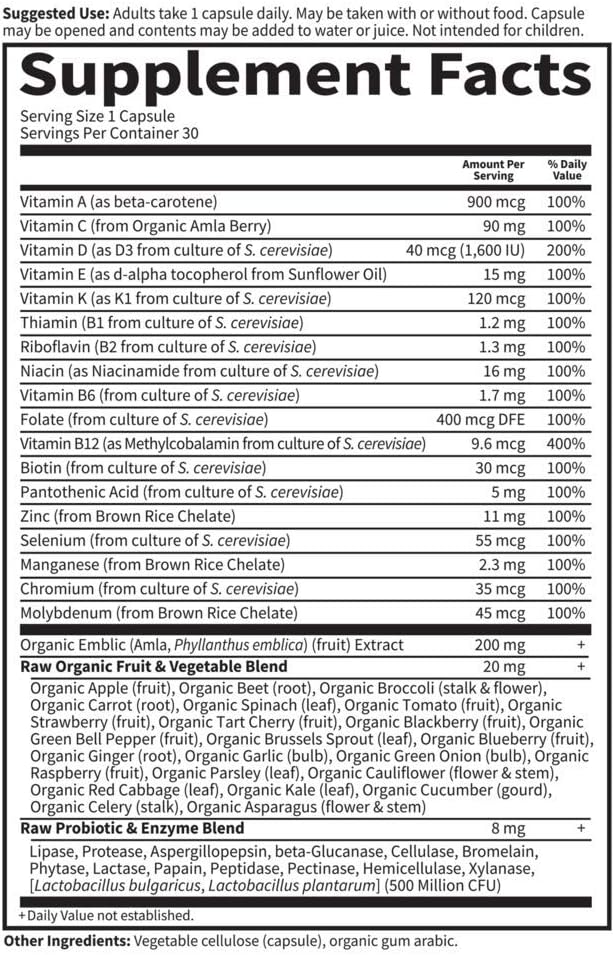 - MULTIVITAMIN WITH PROBIOTICS & WHOLE FOODS: One a day men's vitamins support prostate & heart health, energy and healthy stress response; 24 powdered organically grown raw fruits and vegetables add supporting antioxidants, vitamins & nutrient cofactors
