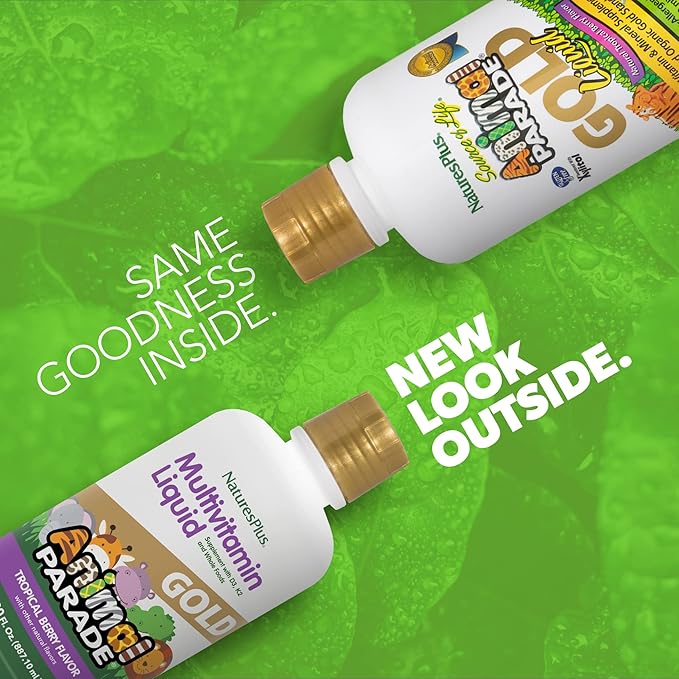 NaturesPlus Animal Parade Source of Life Gold Children's Liquid Multivitamin, 30 OZ - Natural Tropical Berry Flavor - Immune Support Supplement - Organic Whole Foods, Gluten-Free, Vegan - 60 Servings