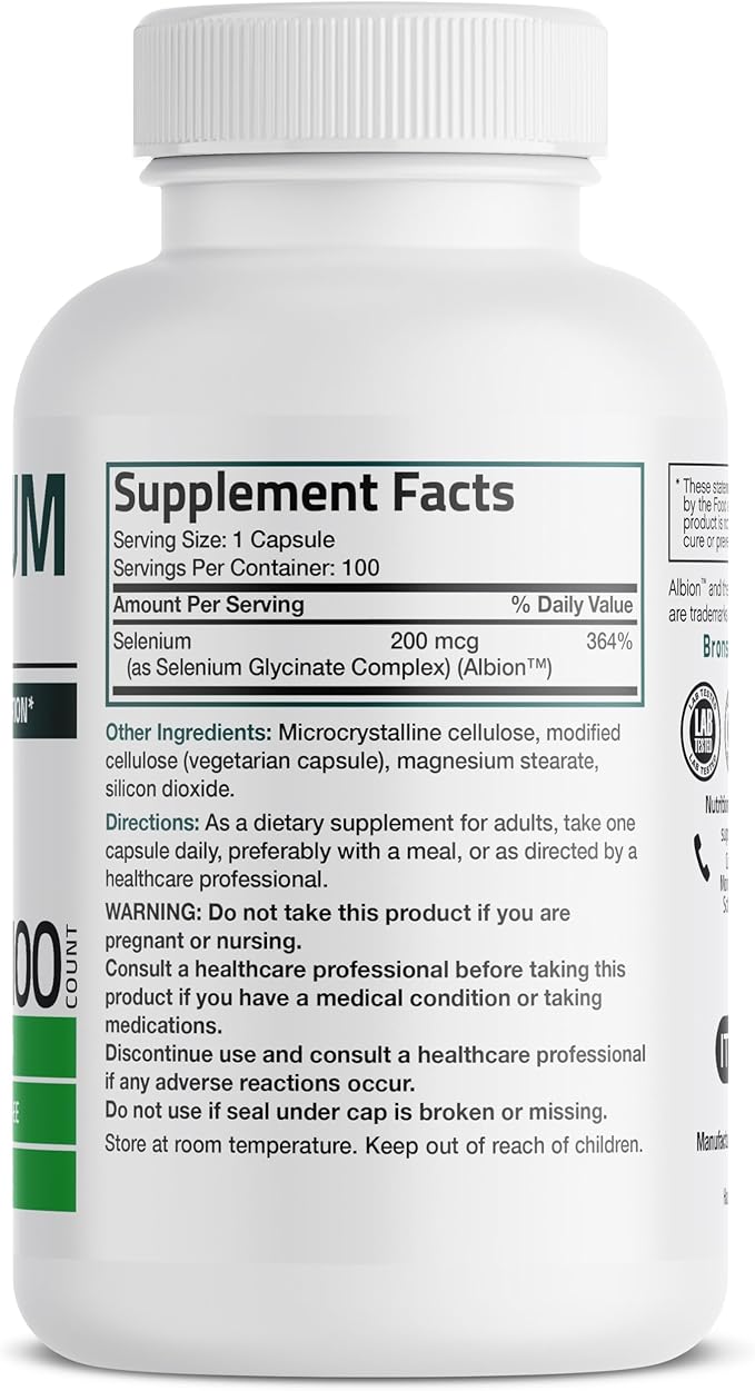 Bronson Selenium 200 mcg – Yeast Free Chelated Amino Acid Complex - Essential Trace Mineral with Superior Absorption, 100 Vegetarian Capsules