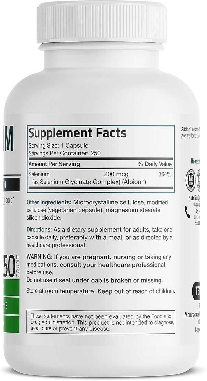 Bronson Selenium 200 mcg – Yeast Free Chelated Amino Acid Complex - Essential Trace Mineral with Superior Absorption, 250 Vegetarian Capsules