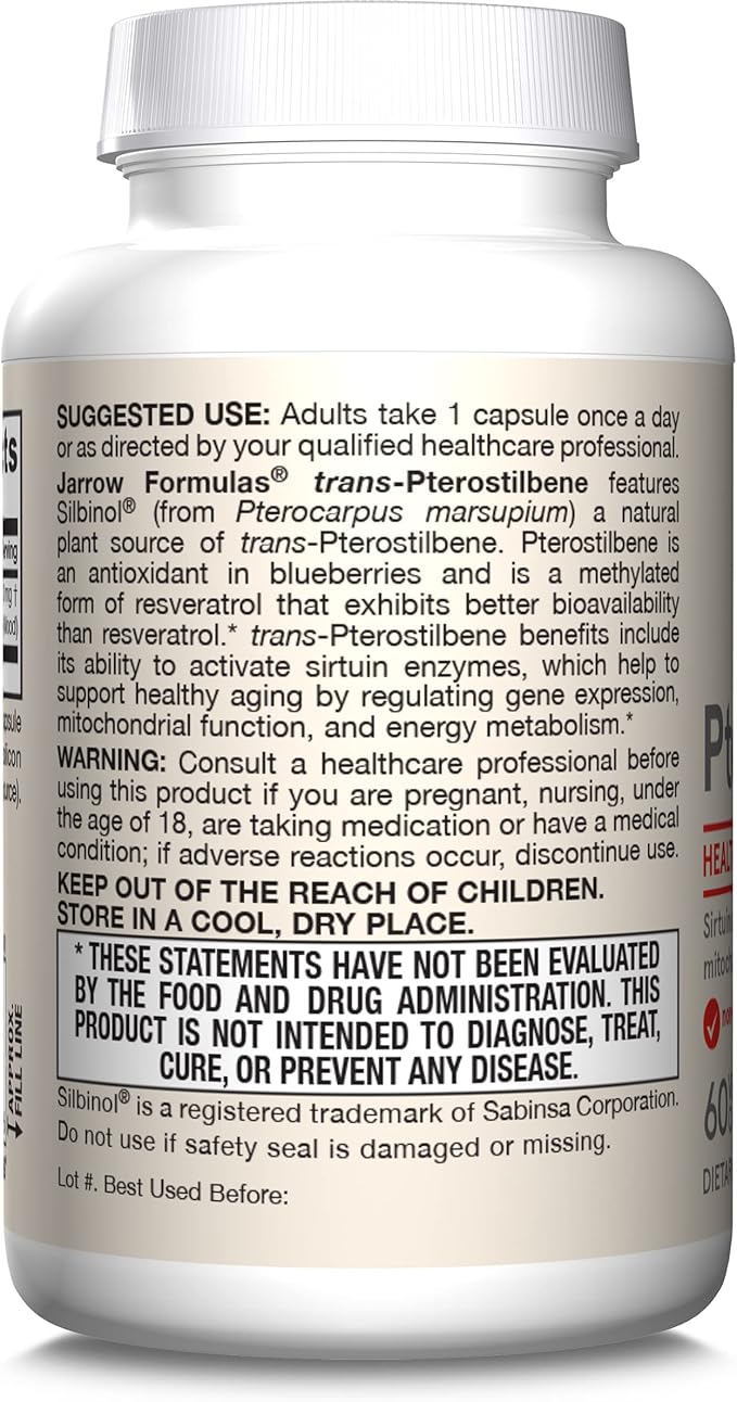 - Antioxidant Support: One 60 count bottle of Jarrow Formulas Pterostilbene 50 mg for up to antioxidant support(1)