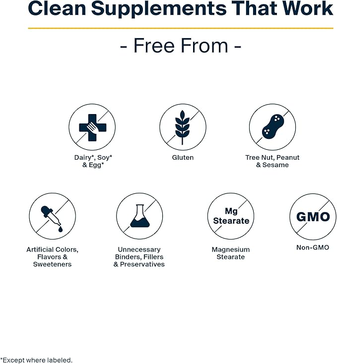 - Clean Formula: Free from gluten, dairy, peanut, tree nut, shellfish, soy, sesame, and egg. Non-GMO. Made without artificial fillers, coatings, binders, or colors