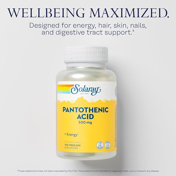 Solaray Pantothenic Acid 500mg - Vitamin B 5 for Coenzyme-A Production and Energy Metabolism, Hair, Skin, and Nails Support - Vegan, Lab Verified, 60-Day Guarantee - 100 Servings, 100 VegCaps