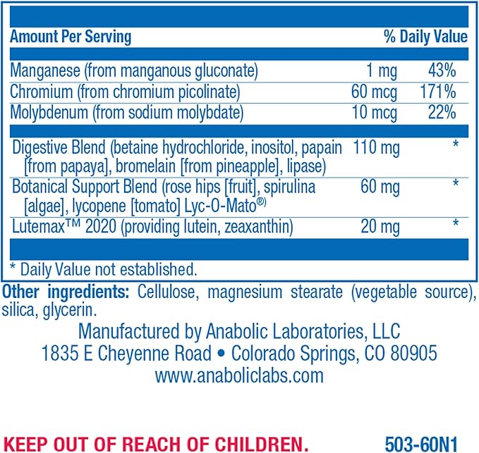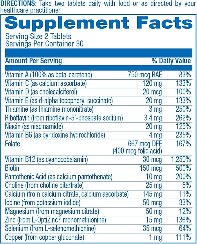 - The multivitamin contains vitamins A, B complex, C, D, and E. It also contains minerals like choline, calcium, phosphorus, iodine, magnesium, zinc, selenium, copper, manganese, chromium, and more.
