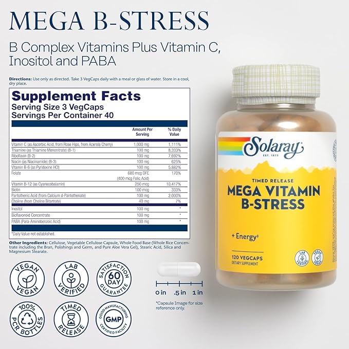 Solaray Mega Vitamin B-Stress, Timed-Release Vitamin B Complex with 1000 mg of Vitamin C for Stress, Energy, Red Blood Cell & Immune Support, 60 Day Guarantee, Vegan, 40 Servings, 120 VegCaps