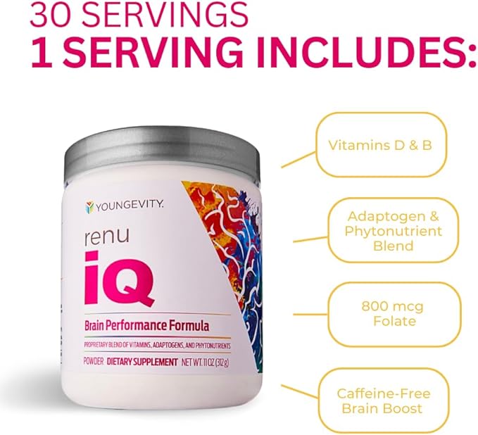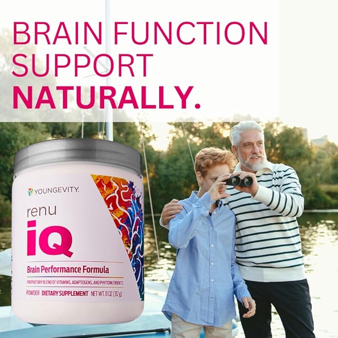 - Holistic Brain Health Support » Youngevity Renu IQ offers holistic brain health support, using a proprietary blend of adaptogens, vitamins, and phytonutrients to promote cognitive function, mood enhancement, and overall brain wellness.