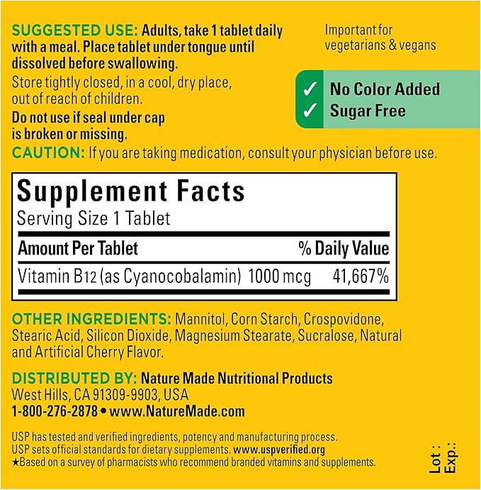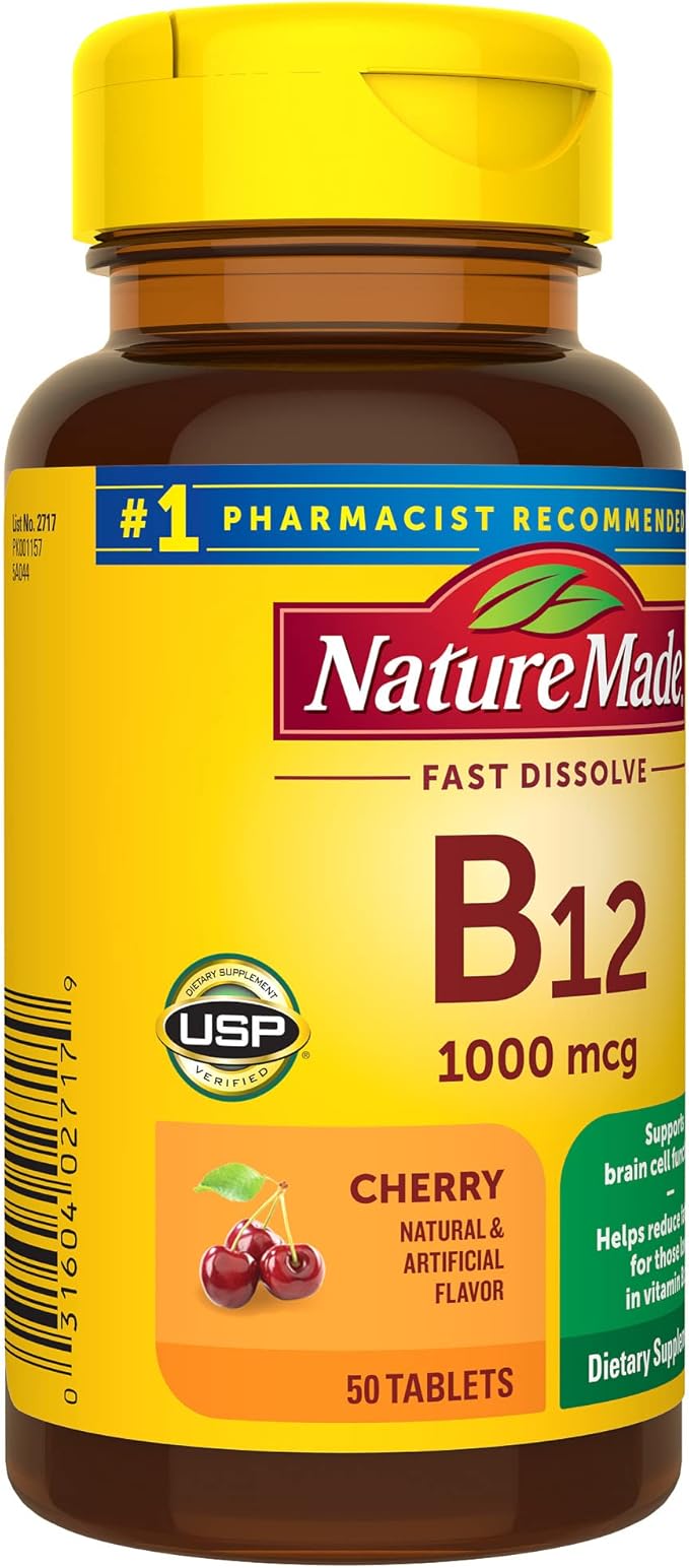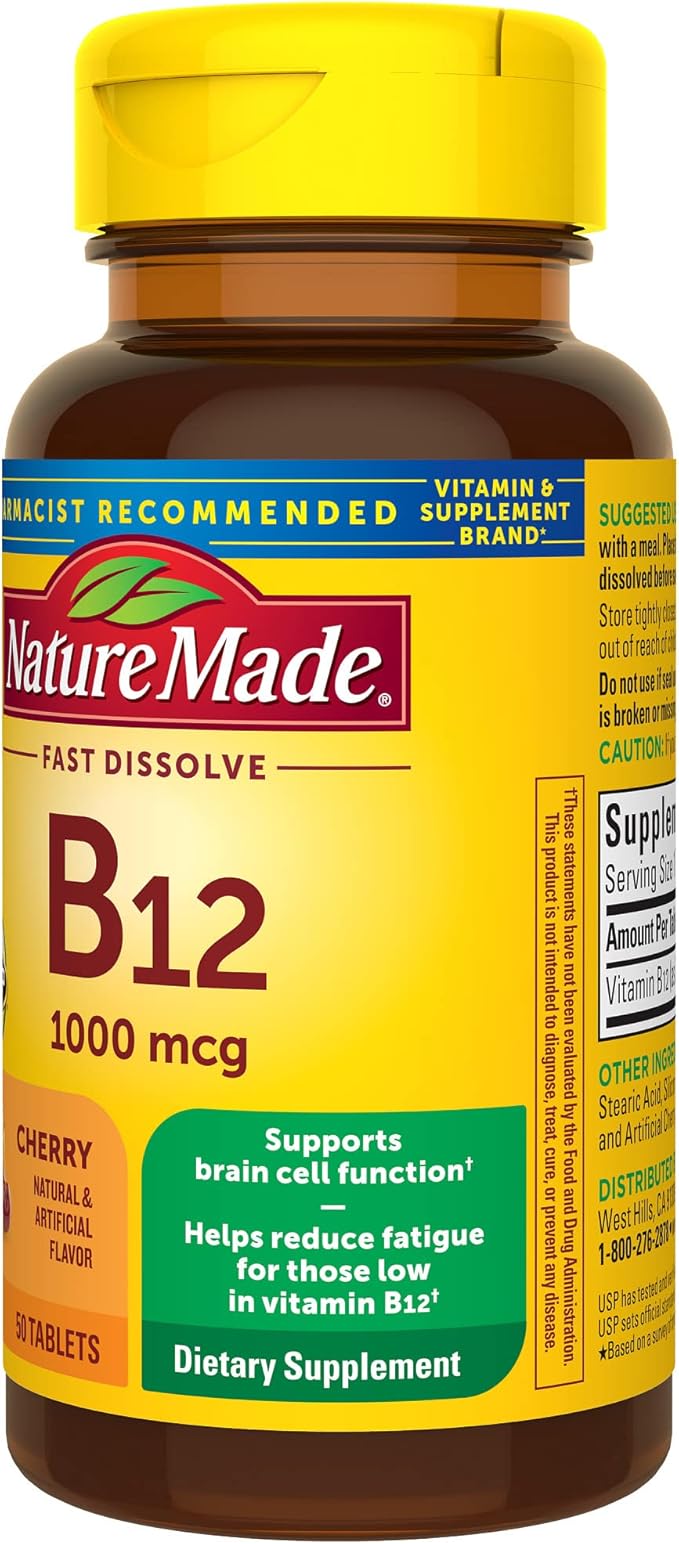 - Energy metabolism support supplement: contains one 50 count bottle of Nature Made Vitamin B12 1000 mcg Fast Dissolve Tablets for a 50-day supply(1)