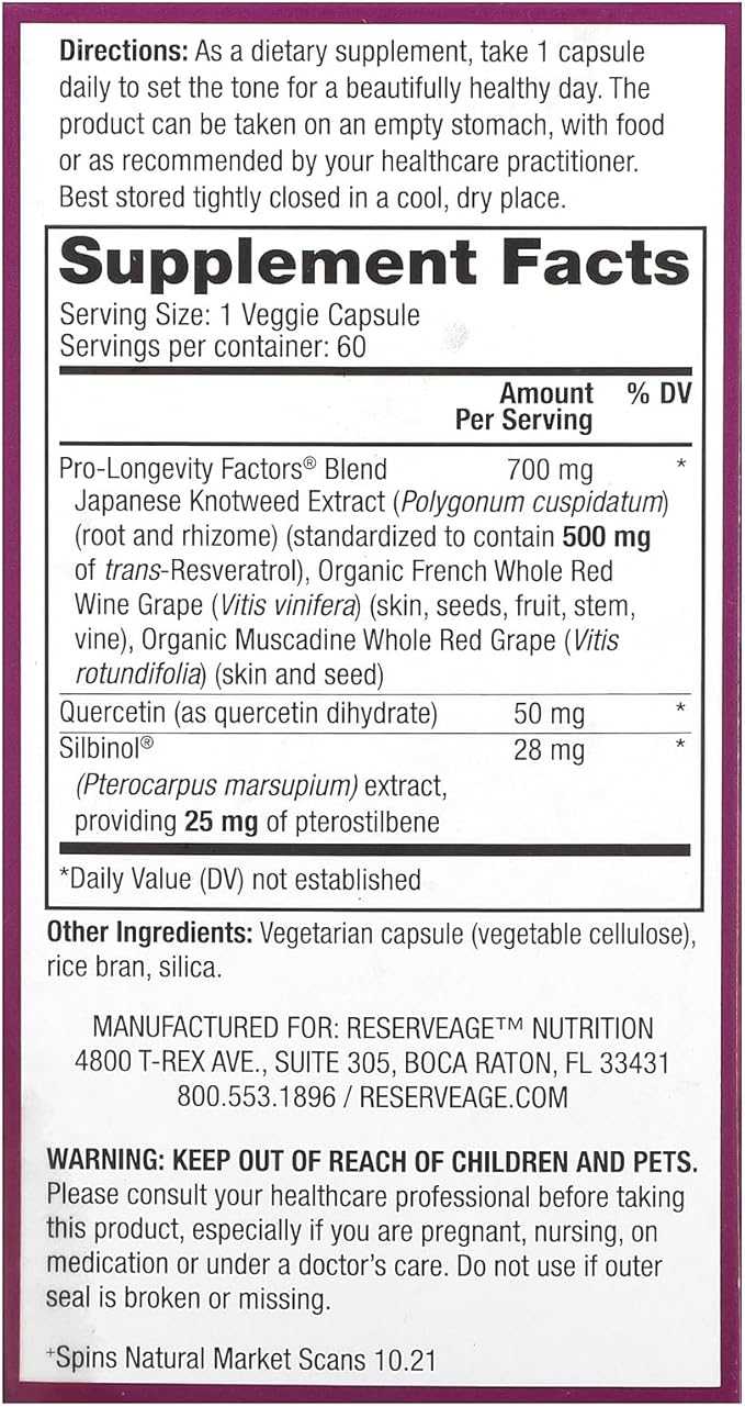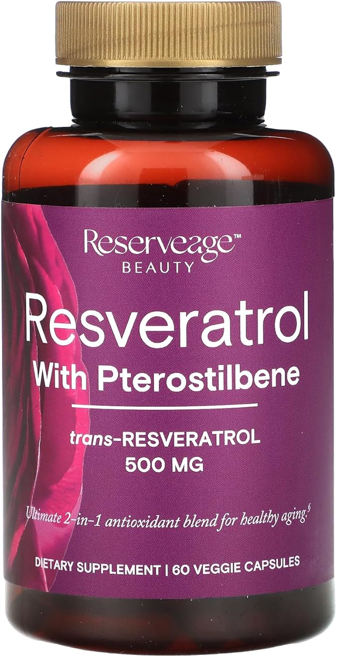 Reserveage Beauty, Resveratrol 500 mg with Pterostilbene, Antioxidant Supplement for Immune Support & Heart Health, Supports Healthy Aging, Paleo, Keto, 60 Capsules (60 Servings)