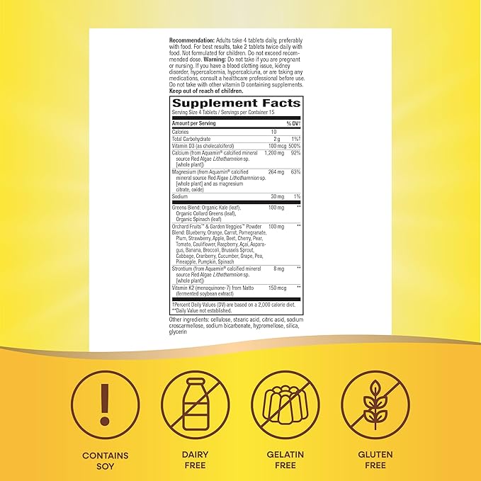 - Supports healthy bones.* Provides 1,200 mg of calcium per 4-tablet serving, vitamin D3, vitamin K2, and magnesium