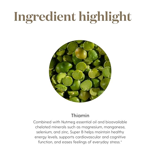 - ESSENTIAL OIL ENHANCED: In addition to the essential B vitamins, Super B contains Nutmeg Essential Oil, methylcobalamin, magnesium, manganese, selenium, zinc, and folate derived from lemon peels.