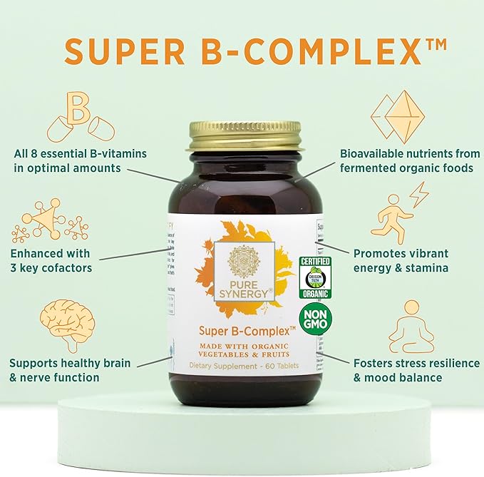 PURE SYNERGY Super B-Complex | Vitamin B Complex Made with Organic Whole Foods | Vegan Supplement with Natural Vitamin B12, Niacin, and Folate | for Energy, Focus and Mood Support (60 Tablets)