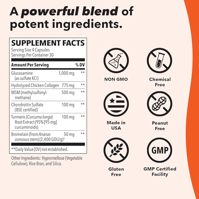 - Clinically Tested Ingredients - Crafted with all natural ingredients, Mobili-T contains a highly absorbed form of Glucosamine, Collagen, MSM, Chondroitin Sulfate, Turmeric, and Bromelain which work synergistically together to help your body to repair tissues and prevent damage.