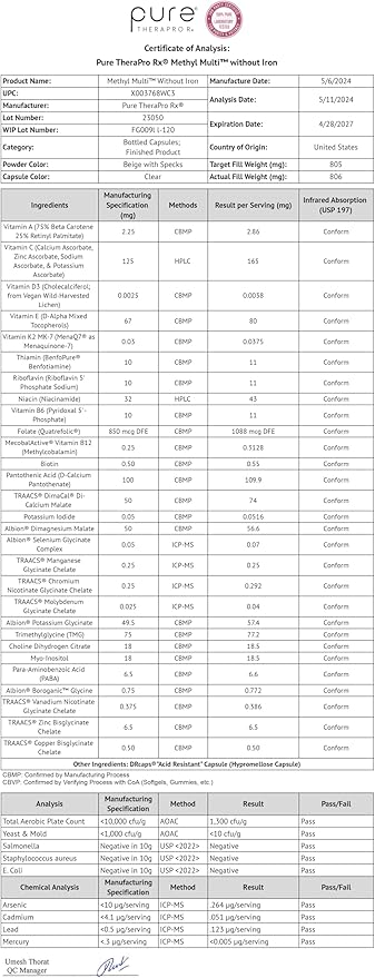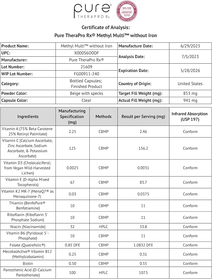 - ππ πππππ πππππ πππππππππππ: Pure TheraPro Rx Methyl Multi without Iron contain no fillers such as rice flour, cornstarch, or wood pulp fibers. Our manufacturing facility adheres to strict NSF/cGMP guidelines. Consumer safety and satisfaction are our highest priority, which is why our products undergo rigorous third-party testing and screening to ensure product purity and potency.