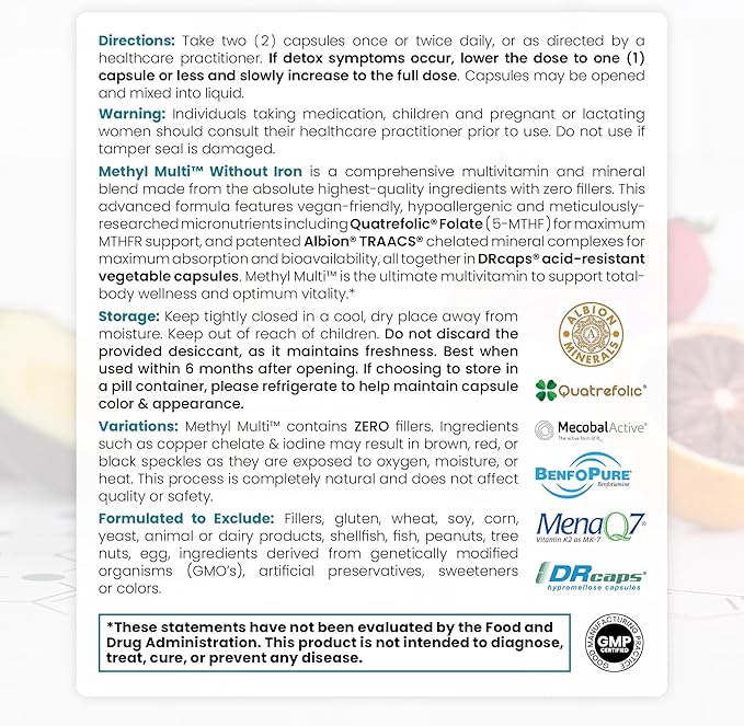 - πππππππ ππππππππππ: When supplementing, absorption is key! Methyl Multi without Iron is formulated with Quatrefolic Folate (5-MTHF), Albion TRAACS mineral chelates, and other micronutrients in their pre-methylated and coenzyme forms for optimal absorption and bioavailability, all together in DRcaps acid resistant vegetable capsules.