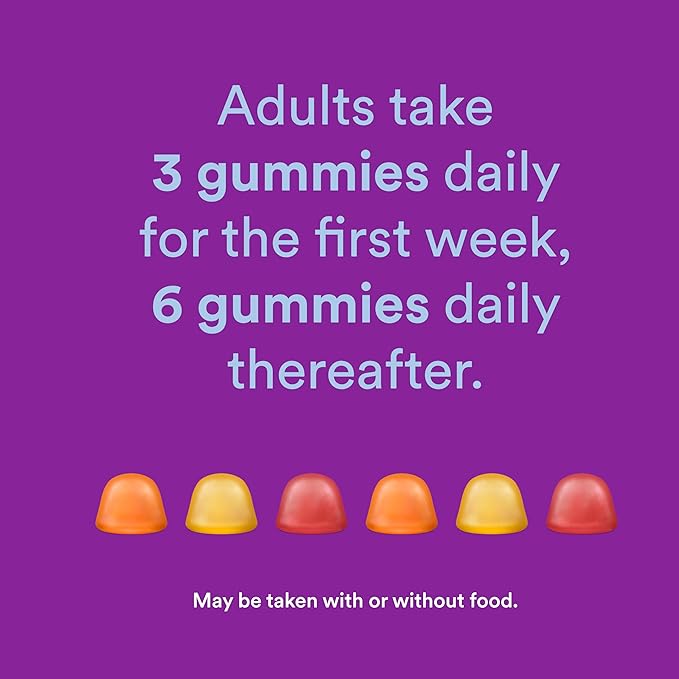 - DELICIOUS TASTE: Lemon, Orange, and Strawberry Banana Flavors with Other Natural Flavors. For adults, take 3 gummies daily for the first week, 6 gummies daily thereafter. May be taken with or without food.
