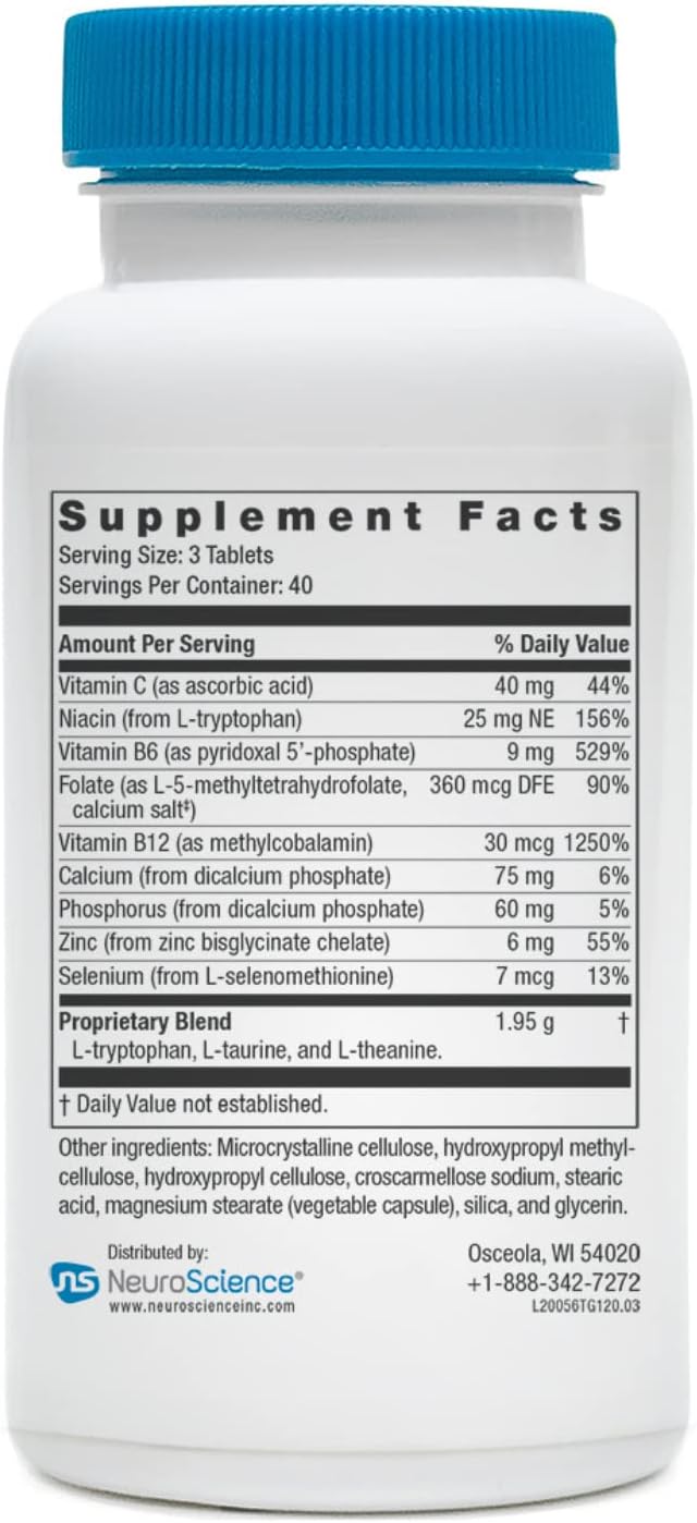 NeuroScience Calm Aid & Mood Support Supplement - TravaGen - with L Tryptophan, L Theanine & Vitamin B12 Complex - Serotonin & GABA Neurotransmitter Supplement (120 Capsules)